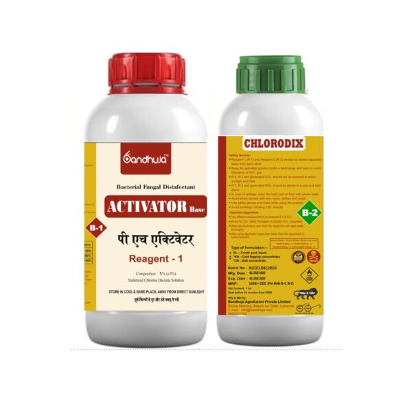 Chlorodix is comprised of two liquid components: Acid  and Base . The activation process is straightforward; it takes just 5 minutes to prepare the solution for use. When 1 liter of Chlorodix is activated, it yields 50,000 ppm of usable chlorine dioxide, making it effective for treating large volumes of water. Specifically, 1 liter can treat 50,000 liters of water at a concentration of 1 ppm.